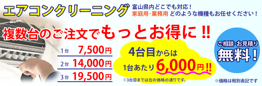 富山エアコンクリーニング、空調清掃、家庭用1台7,500円~!業務用1台15,000円~!冷蔵庫コンデンサー清掃も承ります。定期清掃ご相談ください。